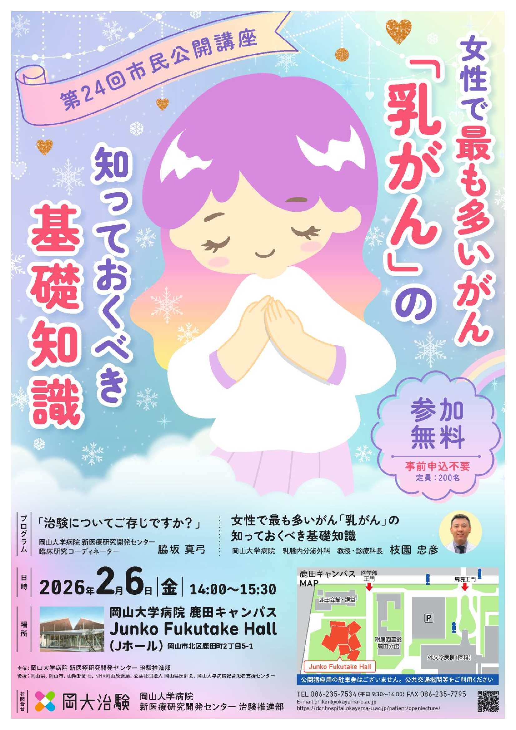 演題 | 1.「治験についてご存じですか?」 岡山大学病院 治験推進部 臨床研究コーディネーター 脇坂 真弓 2.「女性で最も多いがん「乳がん」の知っておくべき基礎知識」 岡山大学病院 乳腺内分泌外科 教授・診療科長 枝園 忠彦 |